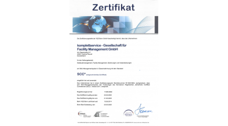 Erneut hat die komplettservice – Gesellschaft für Facility Management GmbH das SCC-Zertifikat erhalten.